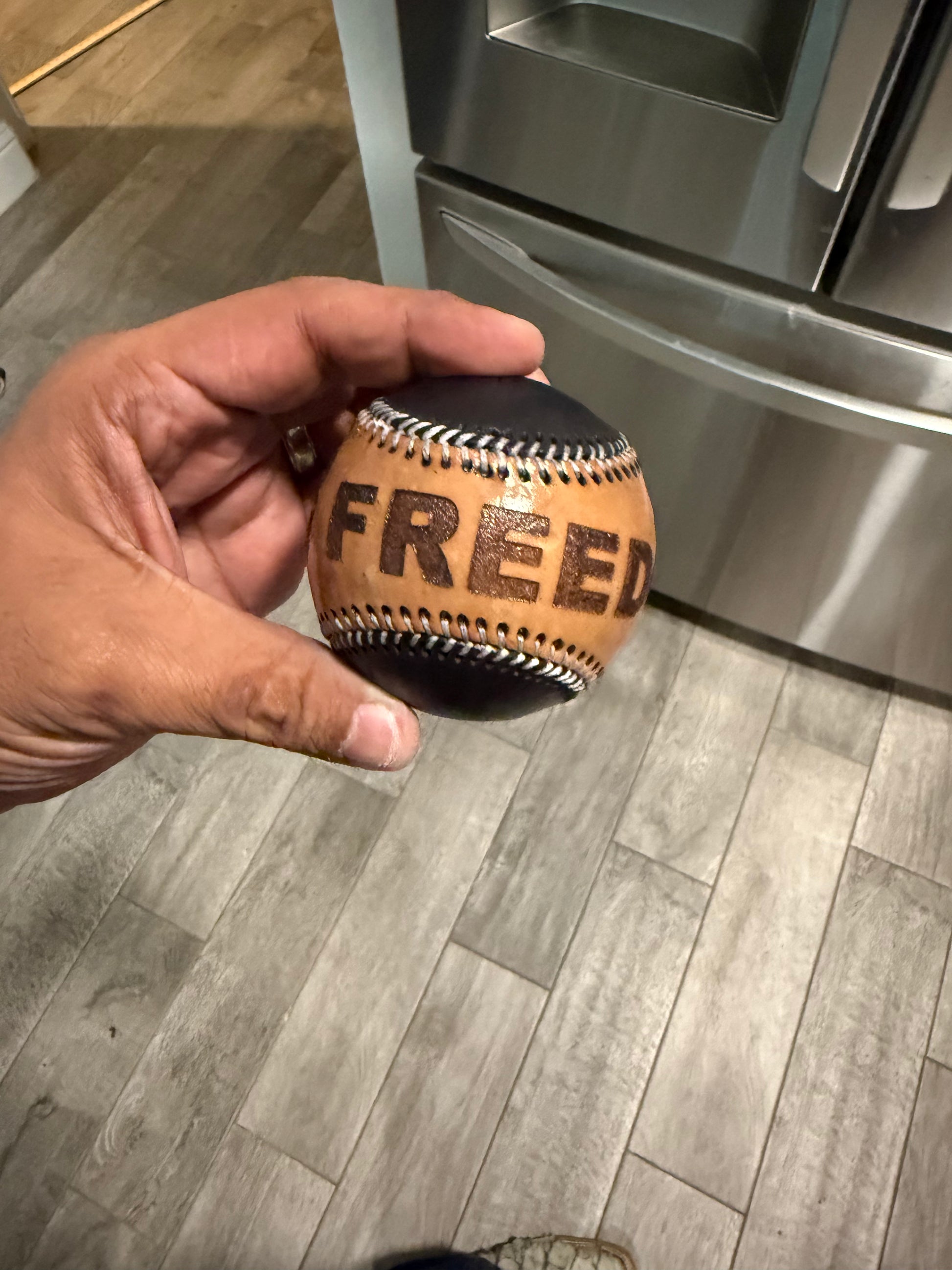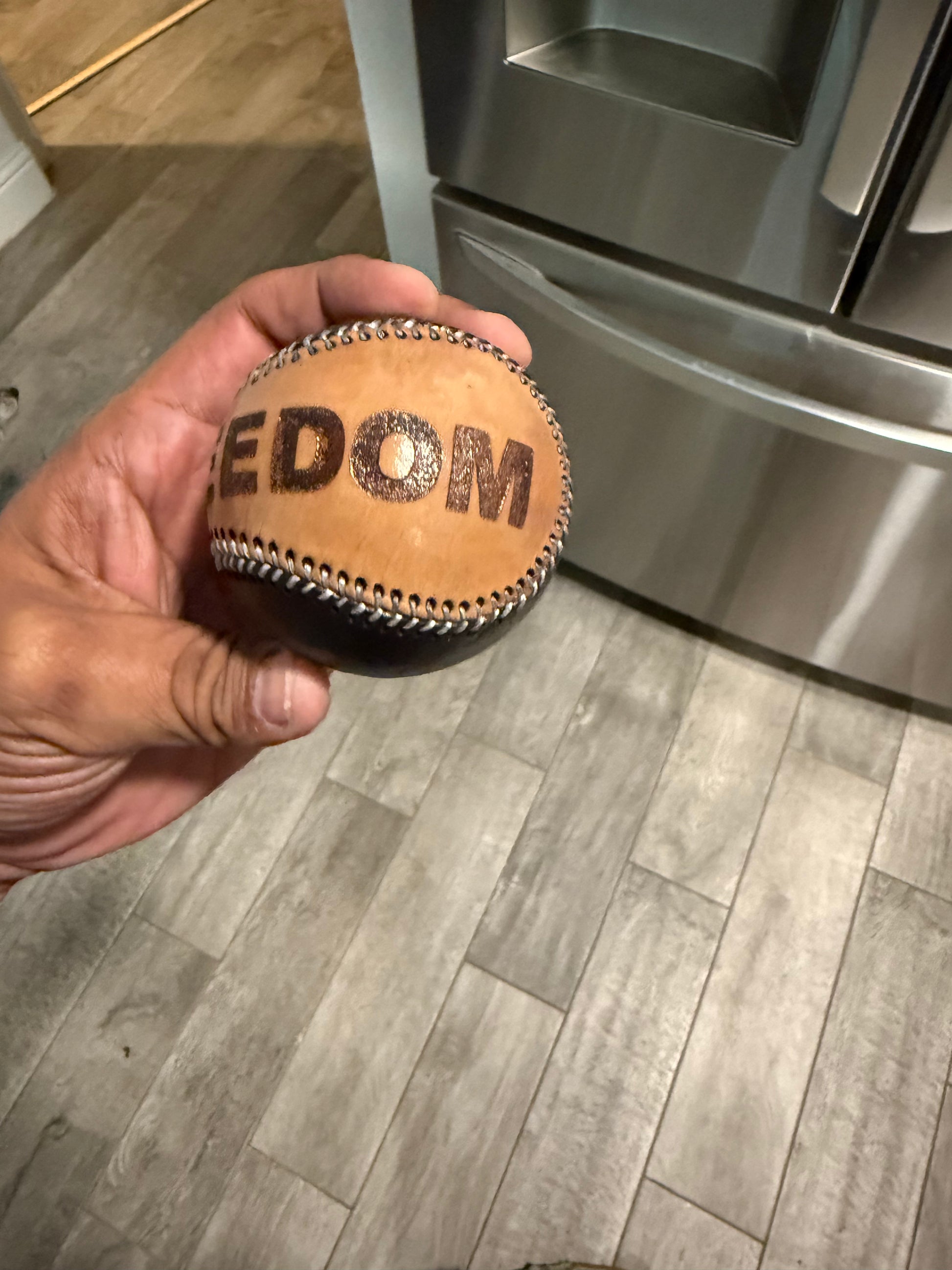 This custom baseball features natural and black leather with white stitching, honoring the memory of the remarkable Charlie Kirk. Combining two deeply American icons—Charlie Kirk and baseball—it serves as a meaningful tribute. Display this piece proudly on your desk as a symbol of respect for a distinguished American whose legacy we recently lost.